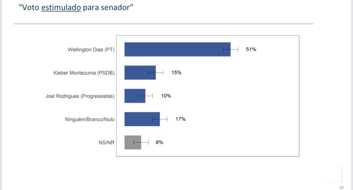 O instituto Vox Populi projetou um cenário para a eleição do próximo senador do Piauí. De forma estimulada, Wellington Dias aparece em primeiro lugar com 51% das intenções de voto. Em segundo lugar vem Kleber Montezuma com 15%. Em terceiro está Joel Rodrigues, com 10%. Ninguém, nulo ou branco ficou com 17%. Não sabe 8%.