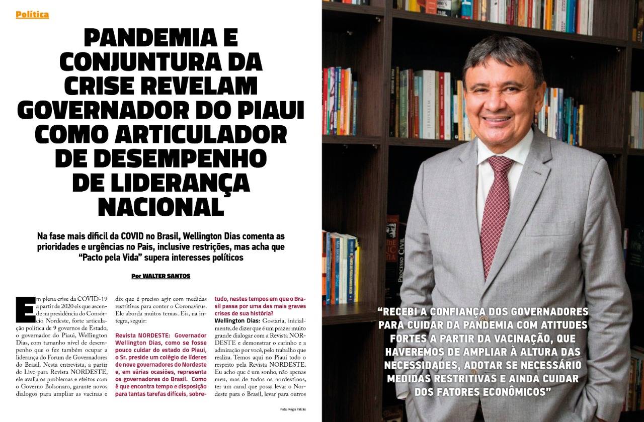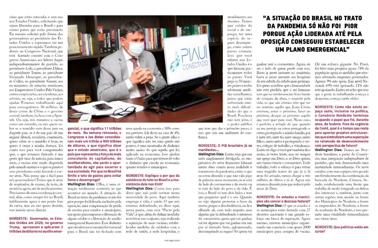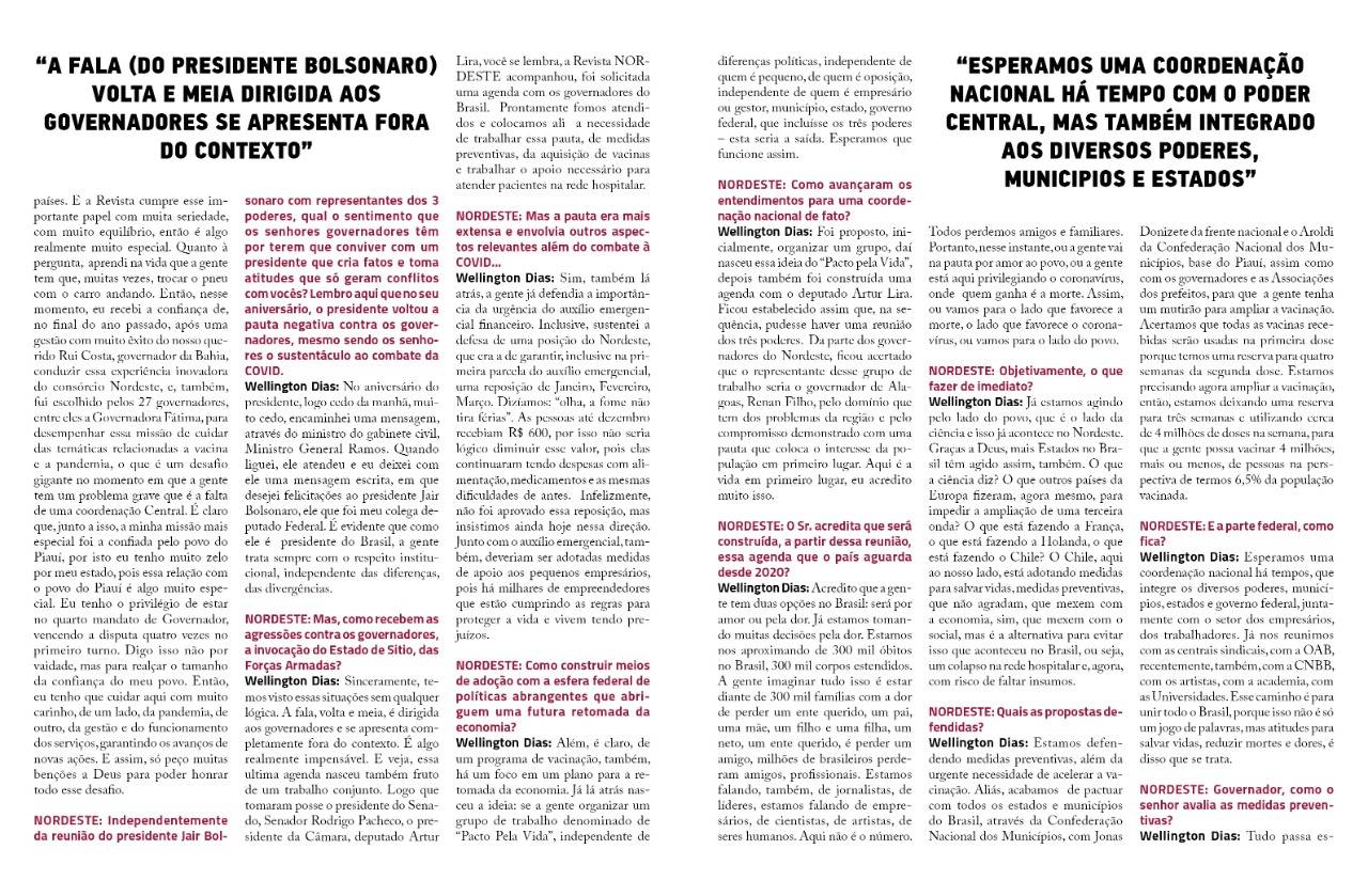 Durante a entrevista concedida pela revista, o governador destaca o trabalho junto com consórcio Nordeste. Para ele é uma missão. "Recebi a confiança dos governadores, para cuidar da pandemia com atitudes fortes, a partir da vacinação que haveremos de ampliar", disse.
