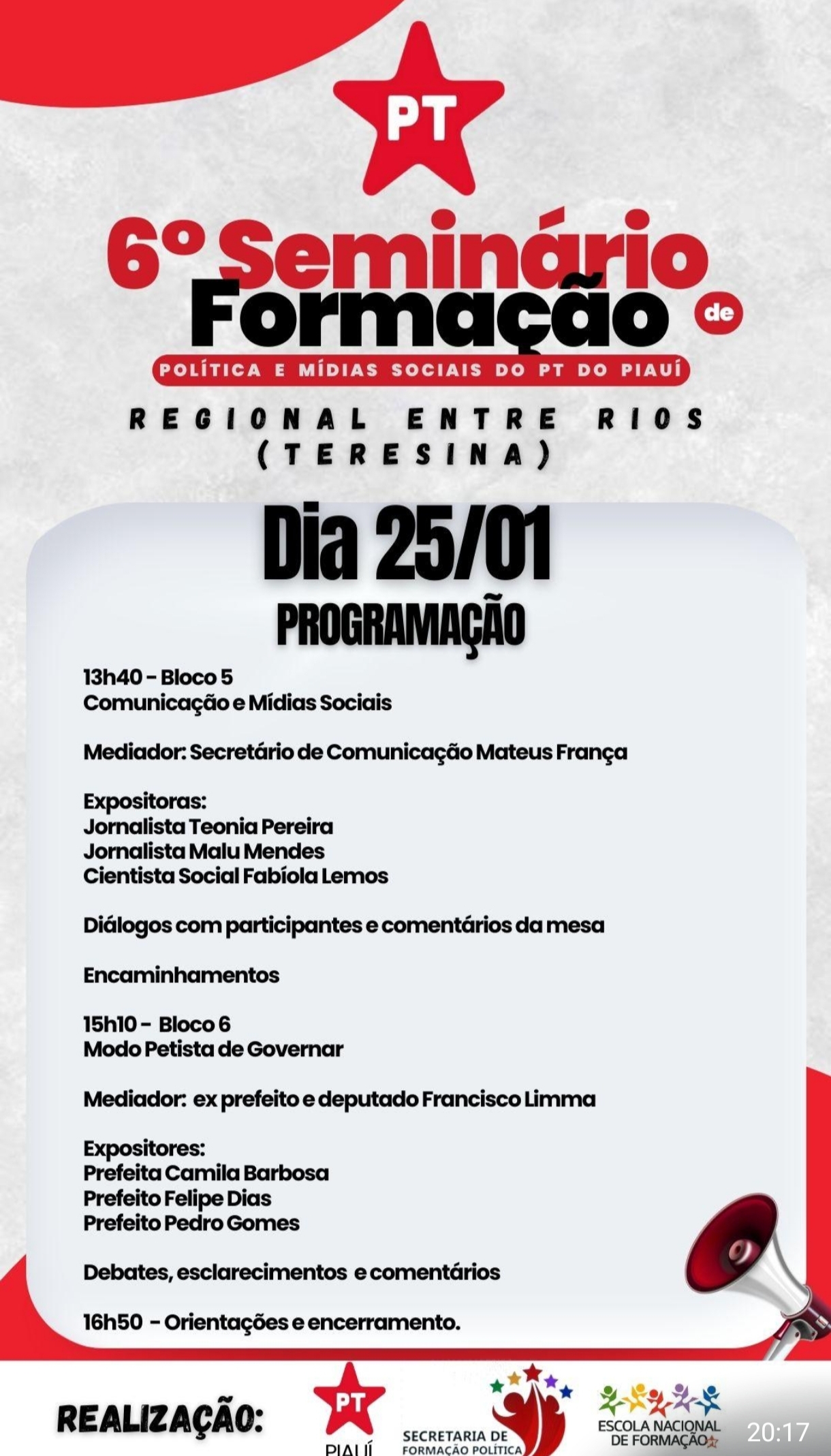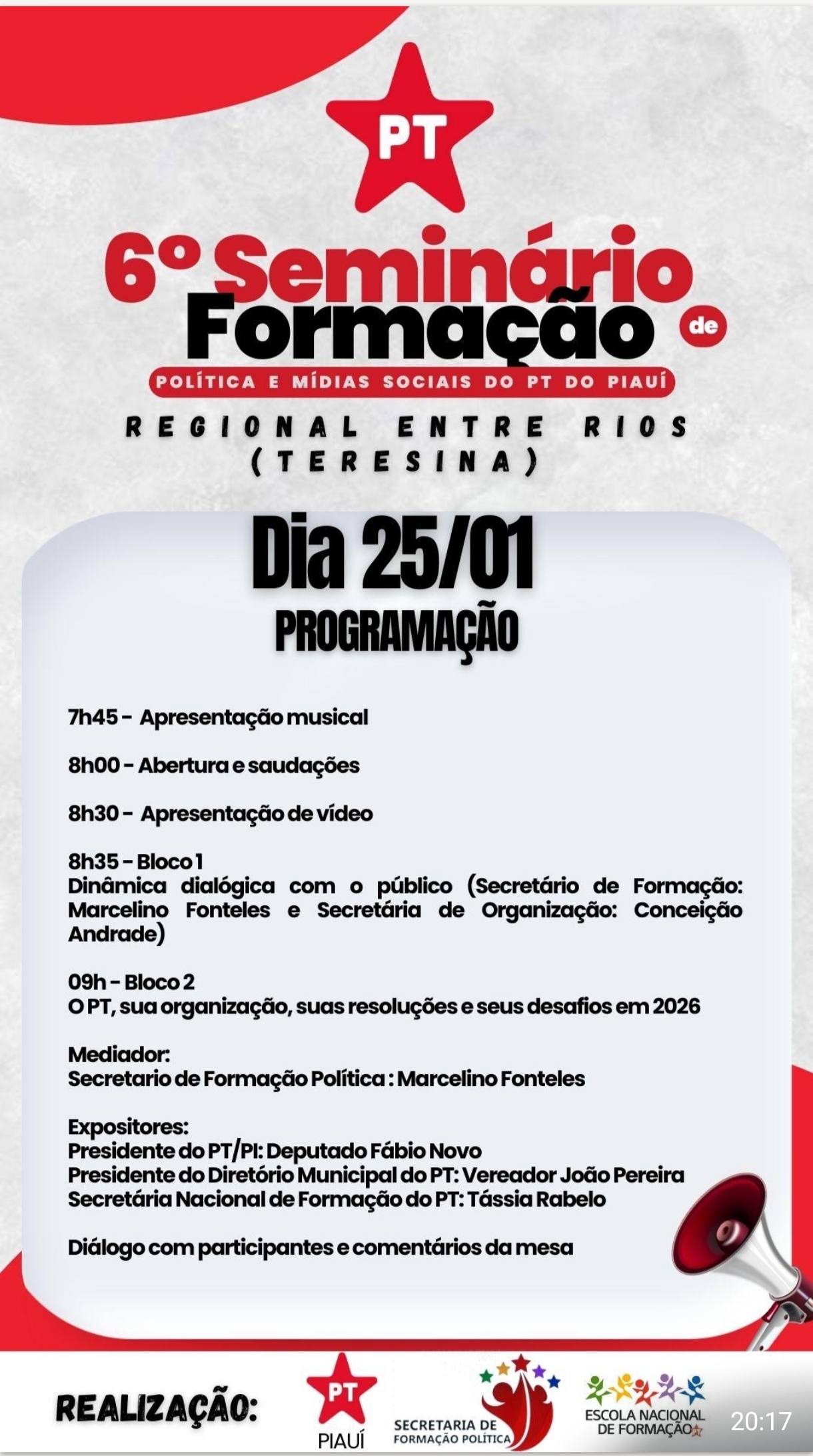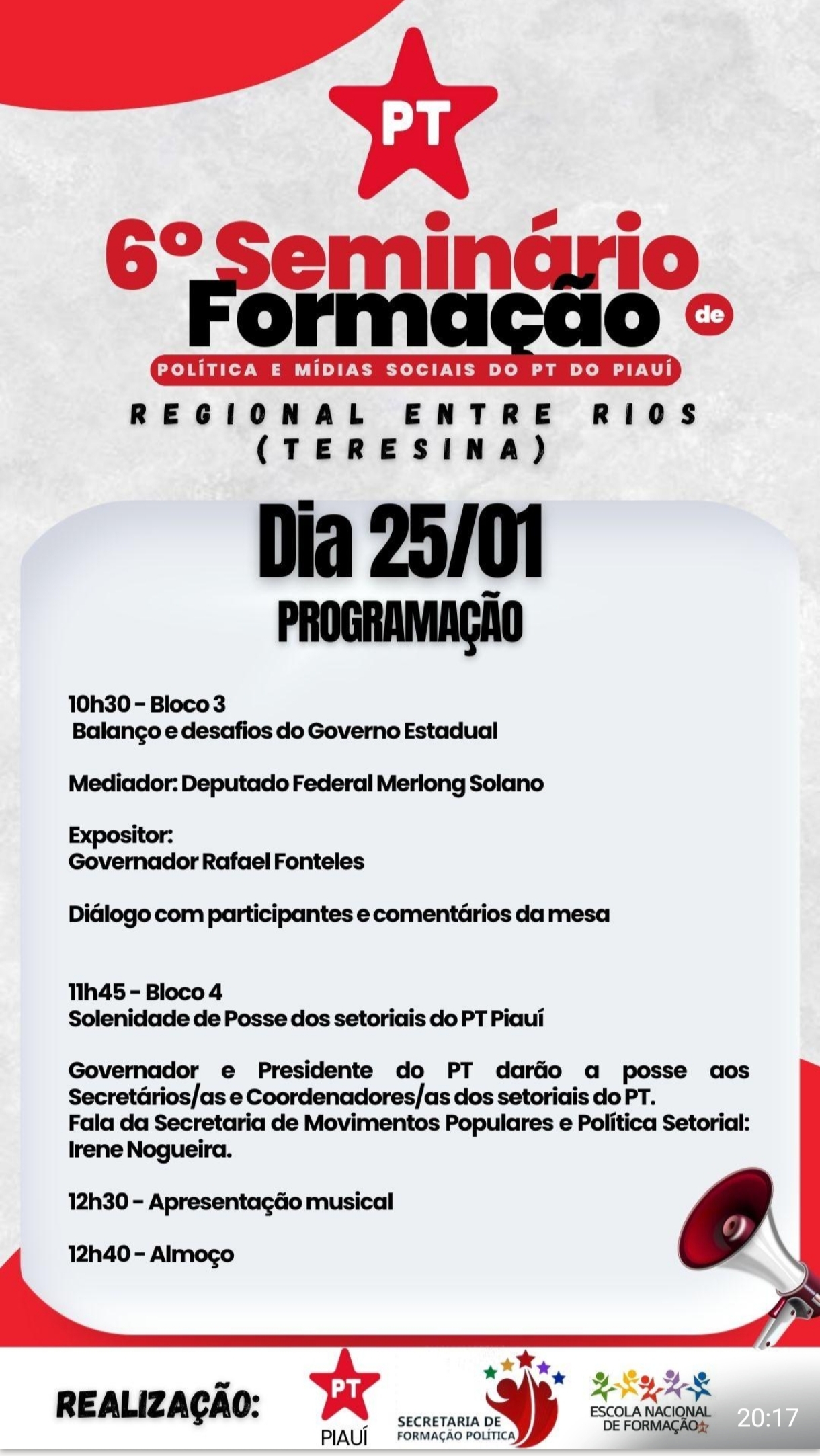 #PT Piauí #seminário PT #Rafael Fonteles #governo do Piauí #formação política #mídias sociais #emprego Piauí #saúde Piauí #segurança Piauí #educação Piauí #infraestrutura Piauí #filiação PT #secretarias setoriais #PT Teresina #gestão petista