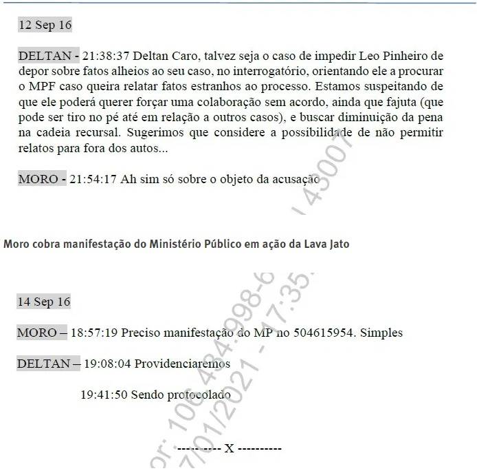 Em uma das mensagens, trocadas em 16 de fevereiro de 2016 e incluída pela defesa de Lula na ação, o então magistrado pergunta se os procuradores têm uma "denúncia sólida o suficiente". Em seguida, o então coordenador da força-tarefa da Lava Jato, o procurador Deltan Dallagnol, informa a ele linhas gerais do que os procuradores pretendiam apresentar contra Lula.