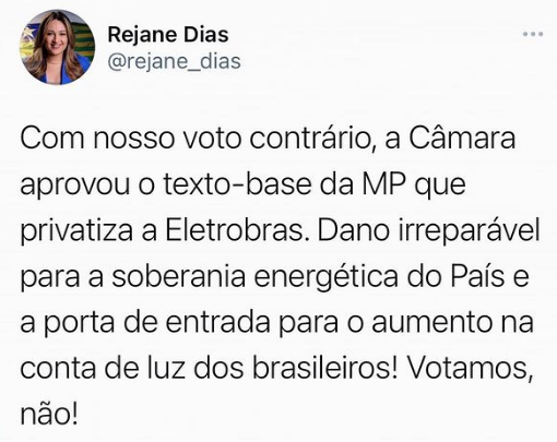 A deputada Rejane Dias (PT), que votou não para a privatização, disse em suas redes sociais que o dano é irreparável para a soberania energética do país e que isso é a porta de entrada para o aumento da conta de luz.