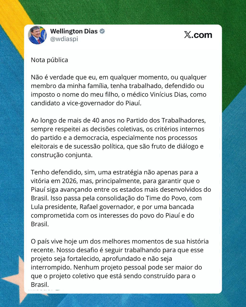O ministro do Desenvolvimento Social, Wellington Dias (PT), usou suas redes sociais para encerrar as especulações sobre possíveis tensões internas no Partido dos Trabalhadores no Piauí. Em nota oficial, Dias desmentiu os rumores de que estaria tentando impor o nome de seu filho, o médico Vinícius Dias, como candidato a vice-governador na chapa de 2026.