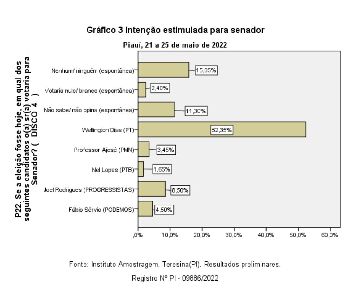 A pesquisa do Instituto Piauiense de Opinião Pública/Amostragem, realizada no período de 21 a 25 de maio, aponta que o ex-governador Wellington Dias (PT) tem 52,35% das intenções de votos dos entrevistados na pesquisa estimulada para cargo no Senado. Em seguida aparece Joel Rodrigues (PP), com 8,50%. Fábio Sérvio (Podemos) aparece com 4,50%, Professor Ajosé (PMN), com 3,45%, e Nil Lopes (PTB), com 1,65%.