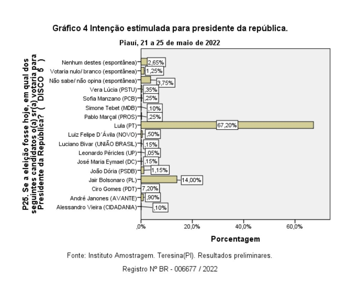 E o instituto ainda registrou a pesquisa estimulada para o cargo de Presidente da República, com o número BR-06677/2022. Nessa modalidade, o levantamento aponta que 67,20% dos entrevistados votariam em Lula (PT), dando ampla margem de vantagem do ex-presidente sobre o atual presidente, Jair Bolsonaro (PL), que registrou apenas 14% das intenções de voto entre os piauienses. Ciro Gomes (PDT) obteve 7,20% na pesquisa estimulada e o ex-prefeito de São Paulo, João Dória (PSDB), que acabou desistindo da pré-candidatura no início desta semana, alcançou 1,15%.