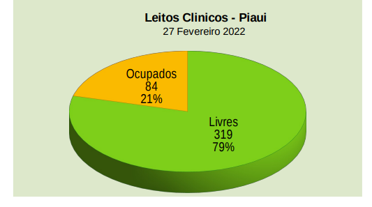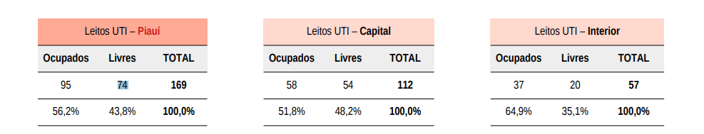 O Piauí tem no total 169 leitos de UTI, incluindo a rede pública e privada. A taxa de ocupação total é 56,2%, ou seja, 95 estão em uso e 74 estão disponíveis. Somente na capital, a taxa de ocupação é 51,8% e no interior do estado é 64,9%.