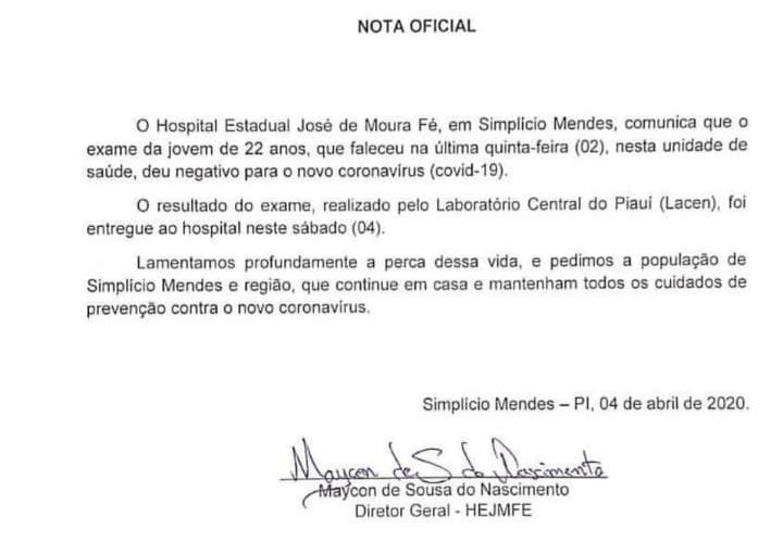 Depois da morte foi pedido exame para saber se a paciente estava com a Covid-19. O resultado saiu neste sábado (04) e foi enviado ao diretor geral do HEJMFE, Maycon de Sousa do Nascimento. Em nota oficial, o médico comunicou que o exame deu negativo para a Covid-19. Ele lamentou a morte da moça e pediu que as pessoas não saiam de casa para se protegerem contra o novo vírus.