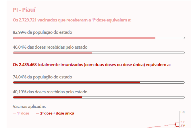 Foram 2.380.091 pessoas que tomaram duas doses da vacina e 52.890 tomaram a vacina de dose única. Ao todo, o Piauí recebeu 5.928.447 doses do Ministério da Saúde e aplicou 5.4779.148 ao longo da campanha de vacinação.