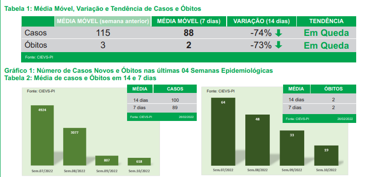 “Já estamos percebendo uma queda acentuada nos números de mortes e também de casos de Covid-19 no Piauí, mais um reflexo da nossa vacinação, que vem sendo uma das melhores do país, mas não podemos relaxar. Se você ainda não recebeu suas doses ou seu reforço, procure os postos de vacinação de seu município e se imunize contra este vírus e mantenha os cuidados higiênico-sanitários”, lembra o secretário de Estado da Saúde, Florentino Neto.