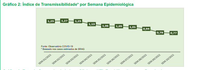 Outro número que está apresentando uma queda acentuada é taxa de transmissibilidade. O relatório da 10ª Semana Epidemiológica apresentou uma taxa de 0,77, o que significa que a cada 100 pessoas contaminadas podem transmitir o vírus para outros 77 indivíduos. O cenário está mais confortável, uma vez que a Organização Mundial de Saúde (OMS) recomenda um RT abaixo de 1.