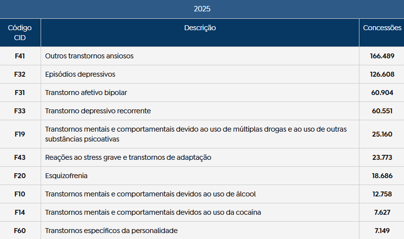 Entre os diagnósticos que mais geraram concessões no país estão os transtornos ansiosos e os episódios depressivos. Somente em 2025, os transtornos ansiosos somaram 166.489 benefícios concedidos no Brasil, enquanto os episódios depressivos chegaram a 126.608. Também aparecem entre as principais causas de afastamento o transtorno afetivo bipolar, o transtorno depressivo recorrente e as reações ao estresse grave e transtornos de adaptação.