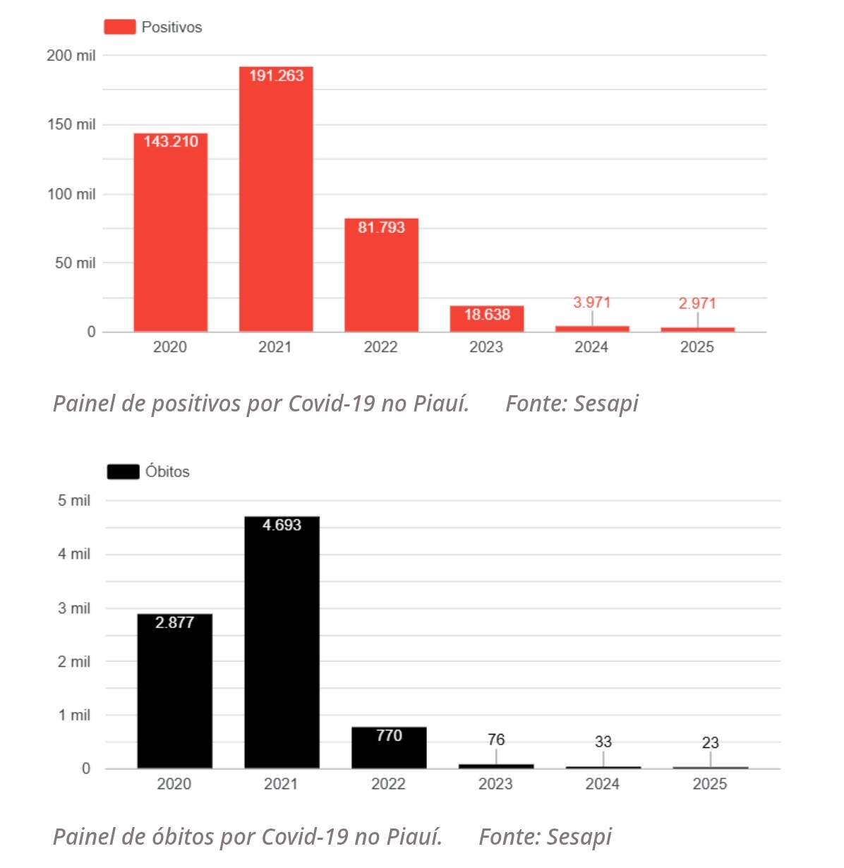 Dados atualizados do painel epidemiológico da Secretaria de Estado da Saúde (Sesapi) mostram que o Piauí contabilizou 441.846 casos positivos e 8.472 mortes por Covid-19 desde 2020, além de mais de 590 mil notificações inconclusivas e 292 mil casos descartados. Apesar de a situação atual ser mais controlada, os números indicam que o vírus ainda circula e continua sendo monitorado pelas autoridades sanitárias.
