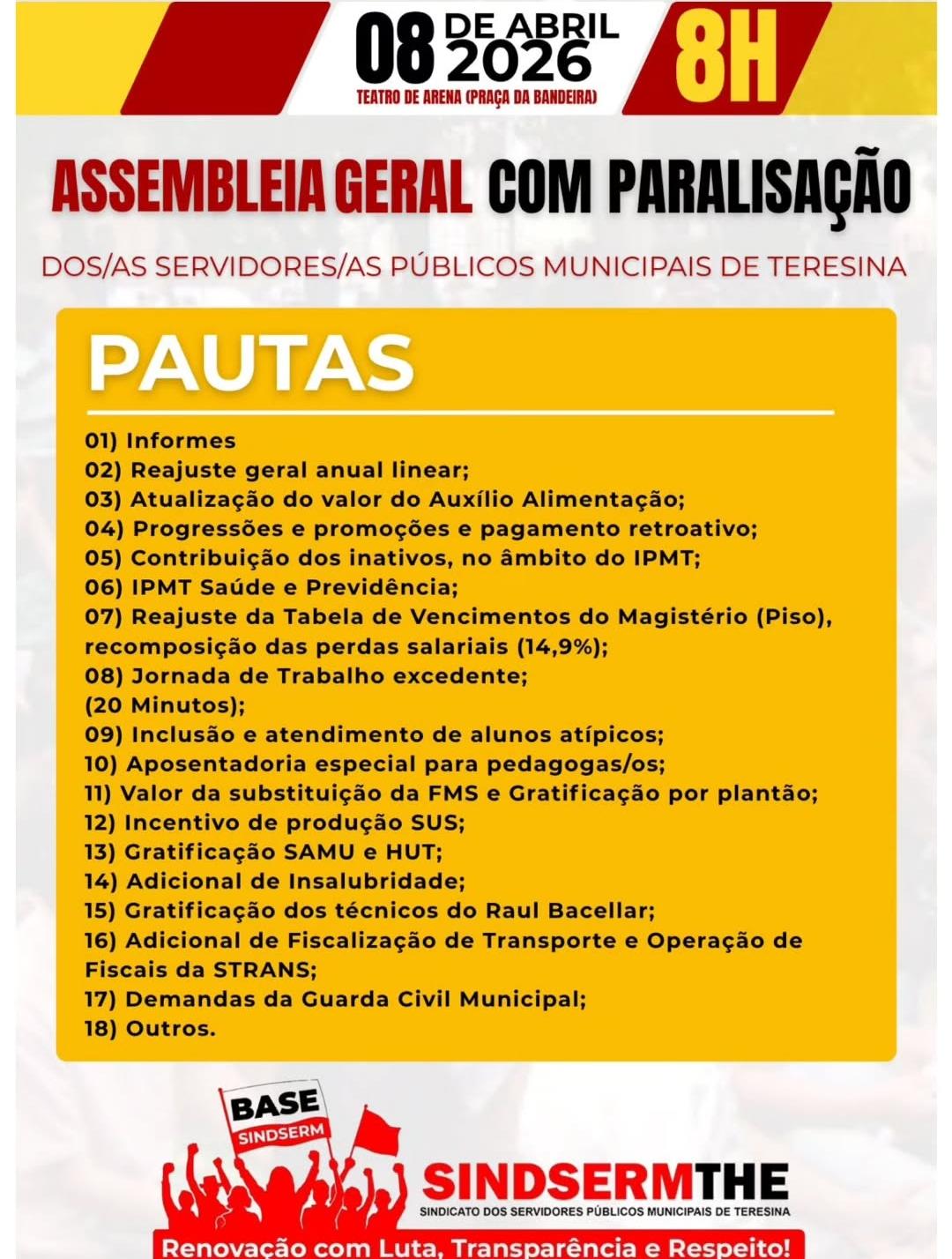 A Assembleia Geral dos servidores e servidores públicos municipais de Teresina será realizada nesta quarta-feira, dia 8, às 8h, no Teatro de Arena, na Praça da Bandeira, no centro da cidade.